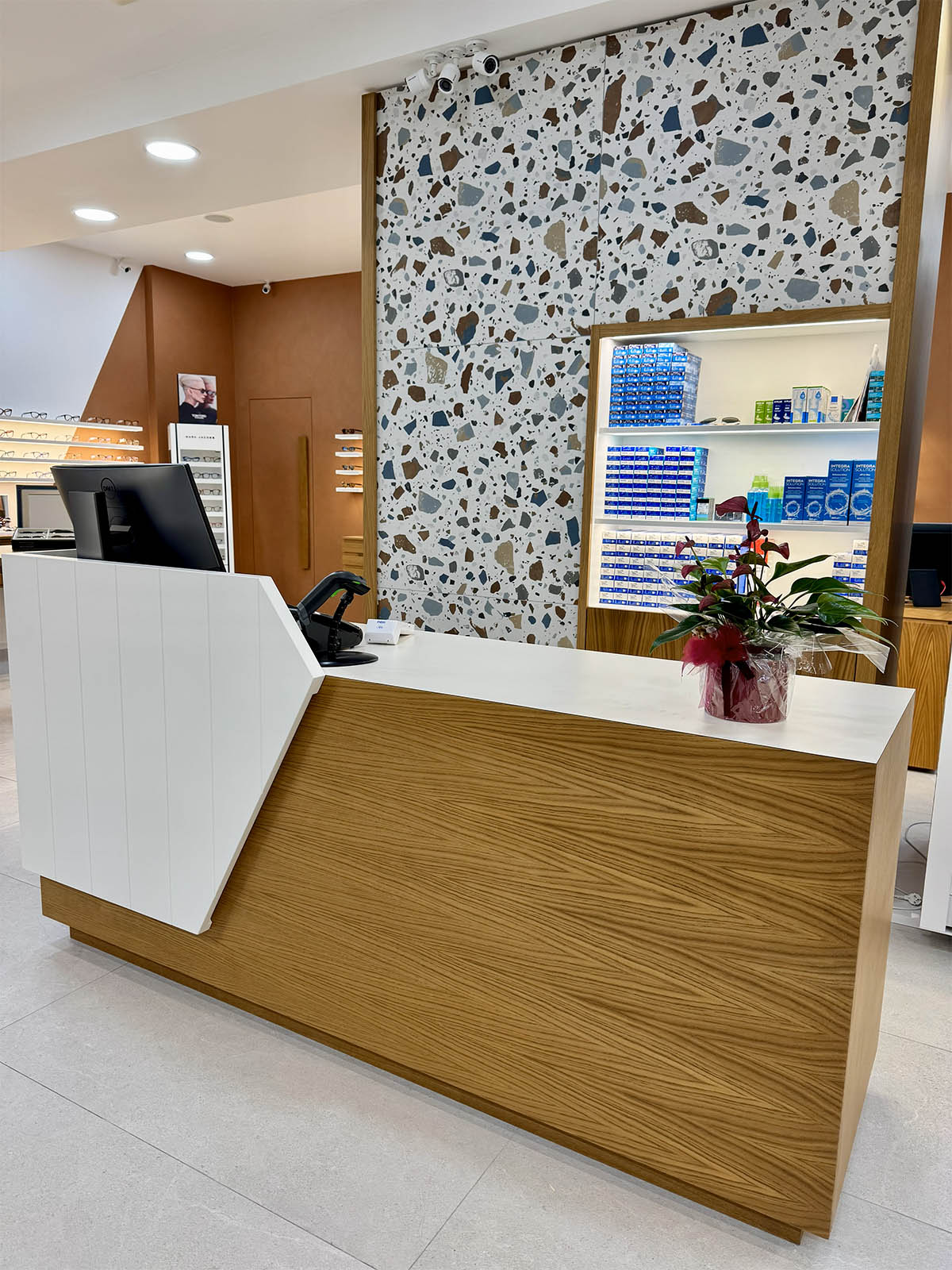 L’intervento ha incluso arredi su misura in legno, espositori lineari con illuminazione integrata e un bancone reception dal design contemporaneo, studiato per garantire accoglienza e operatività. Le superfici, i colori e i materiali sono stati scelti per trasmettere professionalità, pulizia visiva e comfort.