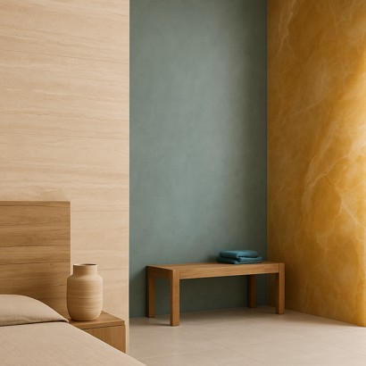 - Travertino effetto gres 60×120, anche in versione 3D per pareti scenografiche e testiere letto.